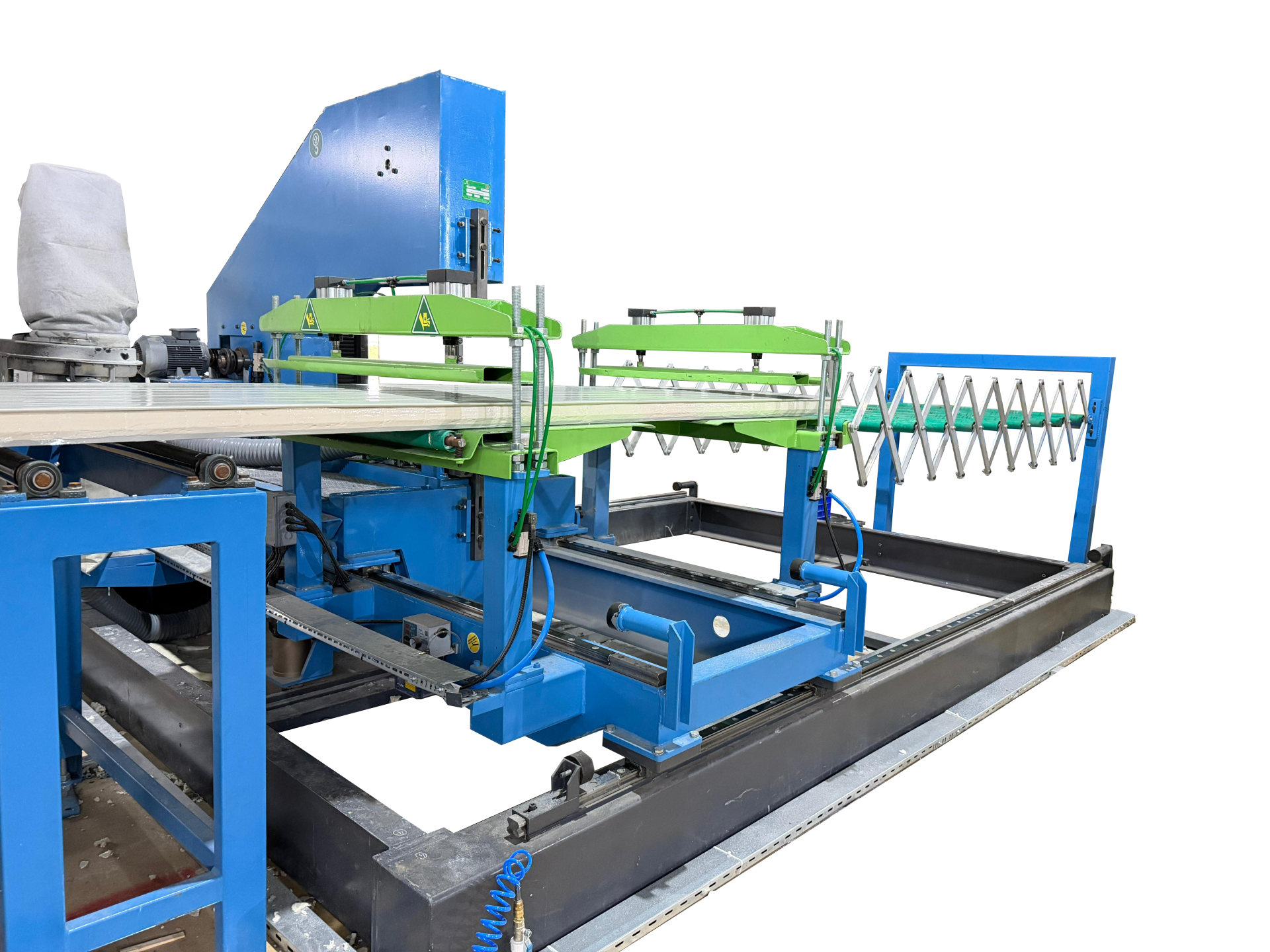 The flying saw unit is one of the most important components in sandwich panel production lines for cutting panels to the desired lengths. This system allows panels to be cut without stopping the production line, increasing efficiency and maintaining high dimensional accuracy.