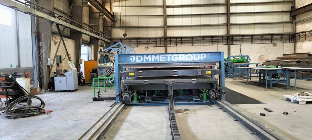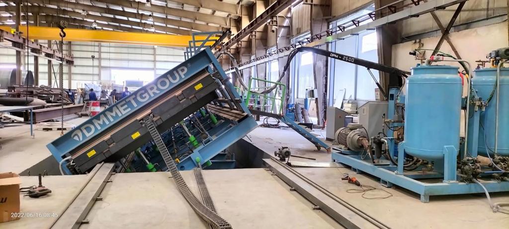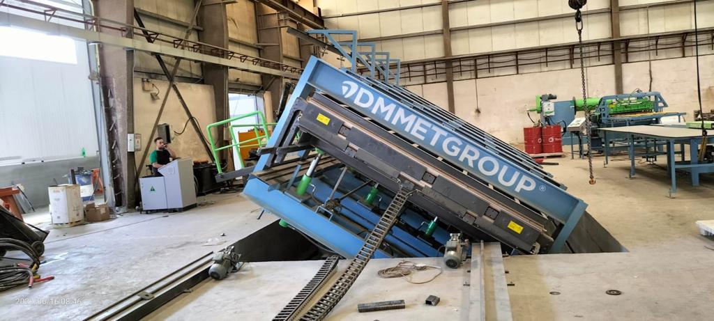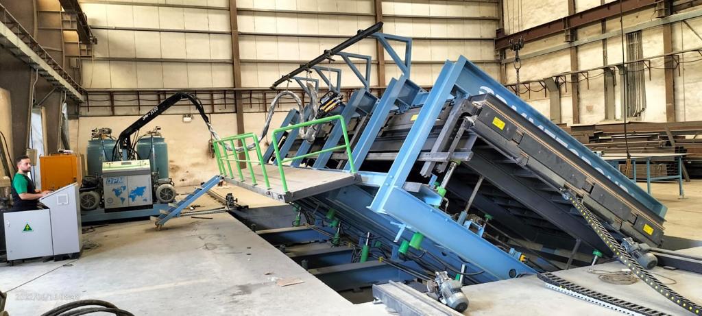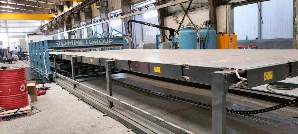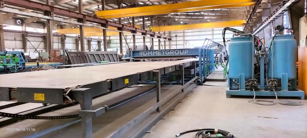 The DPM series polyurethane application machine is designed specifically for the production of sandwich panels for refrigerated truck bodies. The line can be integrated with a discontinuous press. The adhesive application machine features a spray unit mounted on a rotatable 45-degree console, placed on a movable cart on rails. The production is completed by pouring the polyurethane mixture from pre-defined points (e.g., 3000 mm x 8500 mm) into the press.